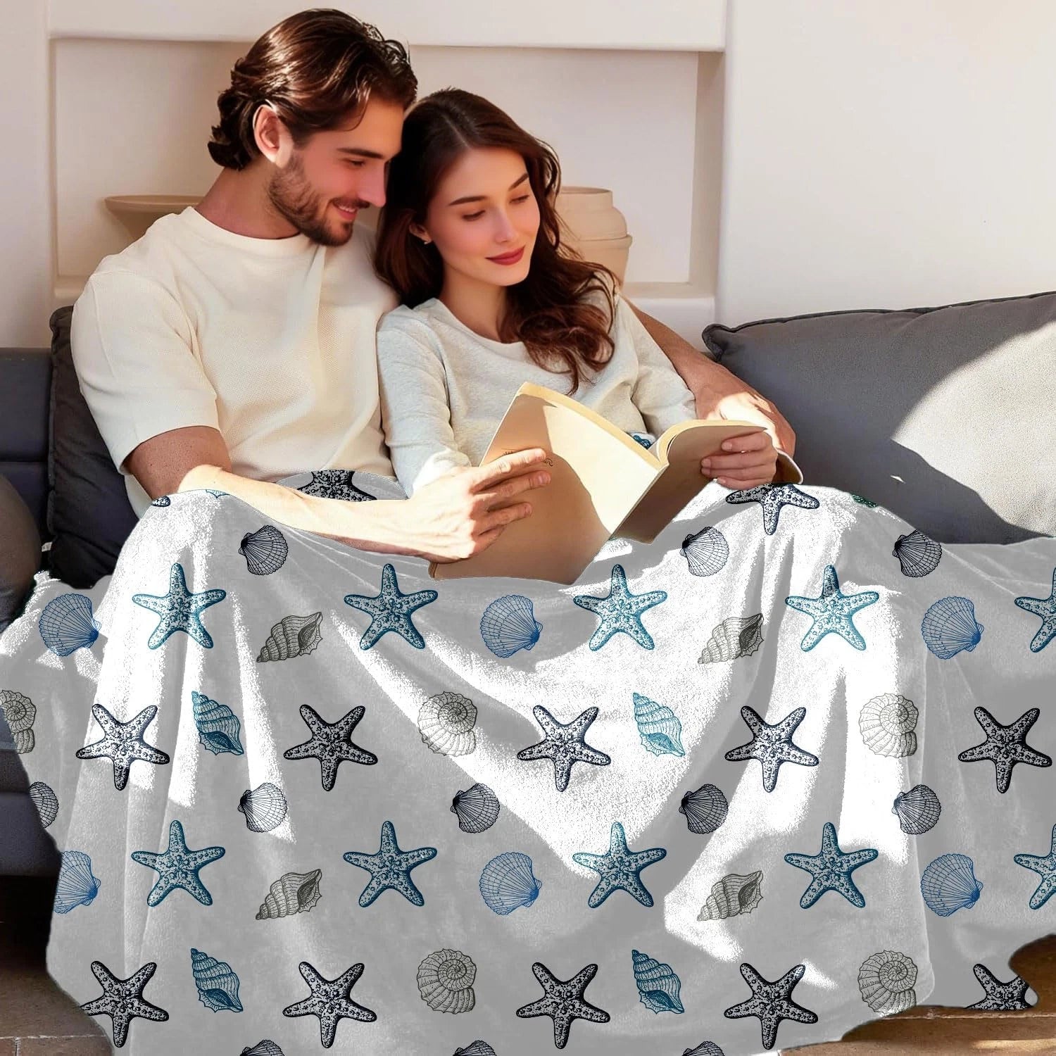 Starfish Seashell Pattern Coastal Throw Blanket